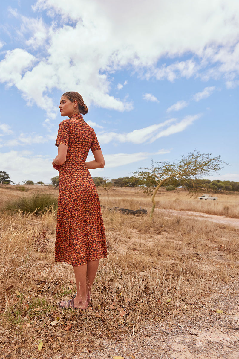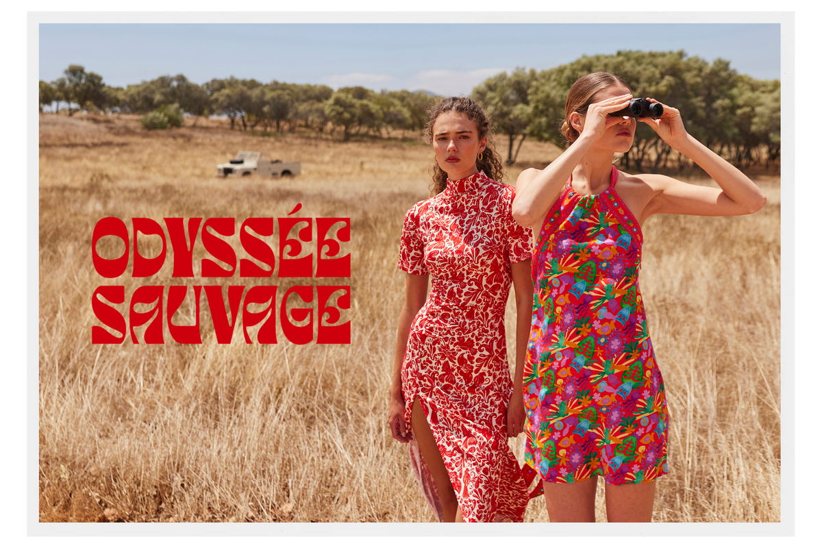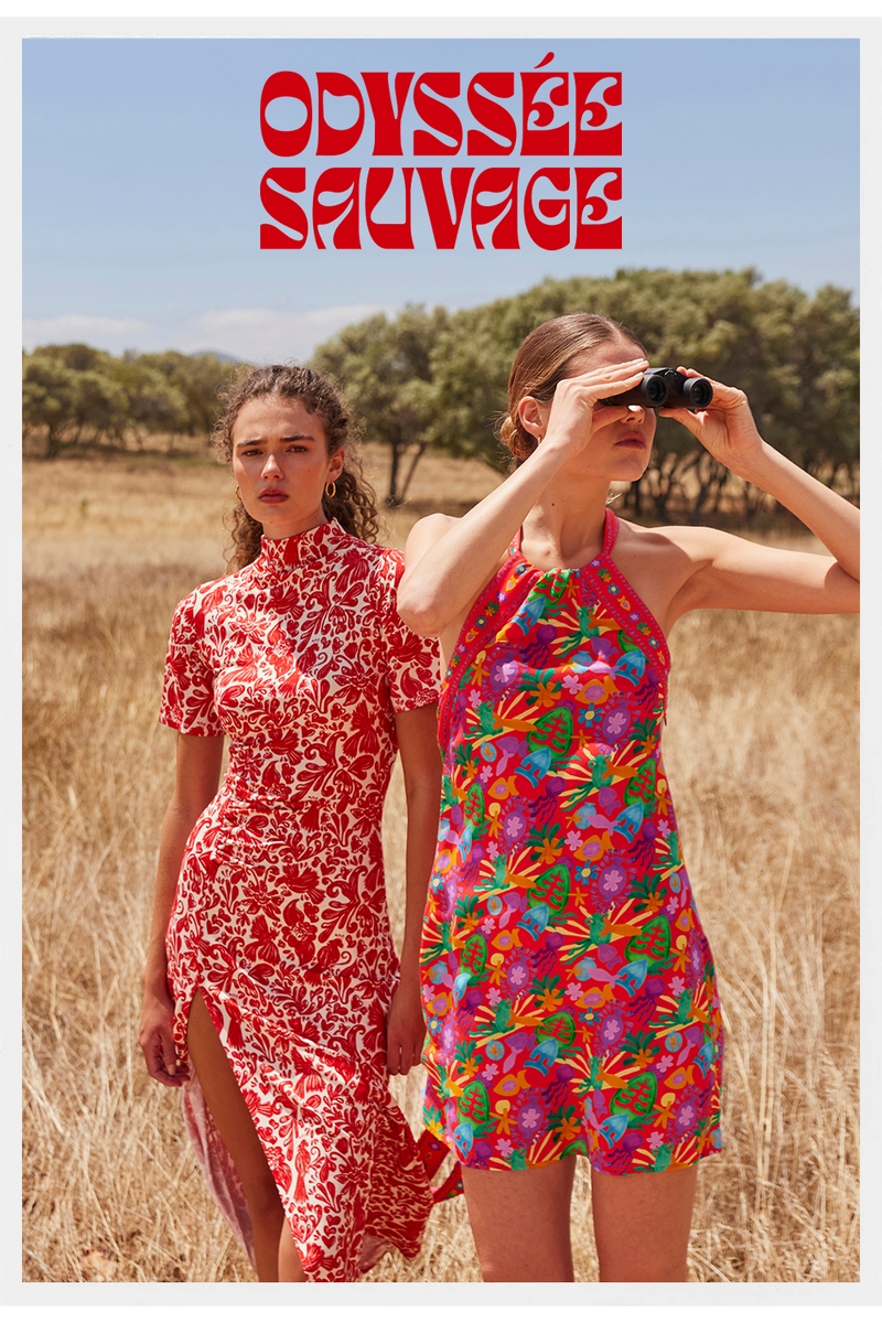 À l’heure où le soleil décline, la lumière devient plus chaude, plus intense. Les imprimés se fondent dans cette nature indomptée, les coupes suivent le corps avec fluidité et caractère. Chaque pièce accompagne le mouvement, libre et instinctif, dessinant une allure féminine, affirmée, profondément vivante.