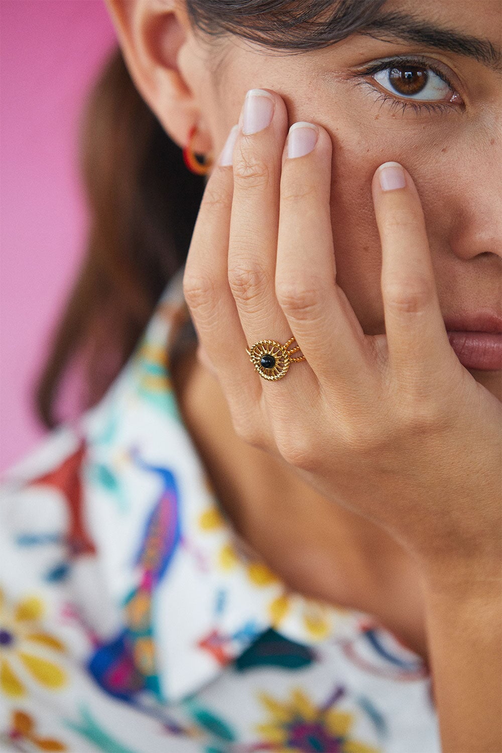 - Gold-plated stainless steel ring - Water-resistant - Long-lasting, 1-year warranty - Hypoallergenic (nickel-, lead- and cadmium-free) - Fancy ring set with a pretty brown stone - Adjustable size