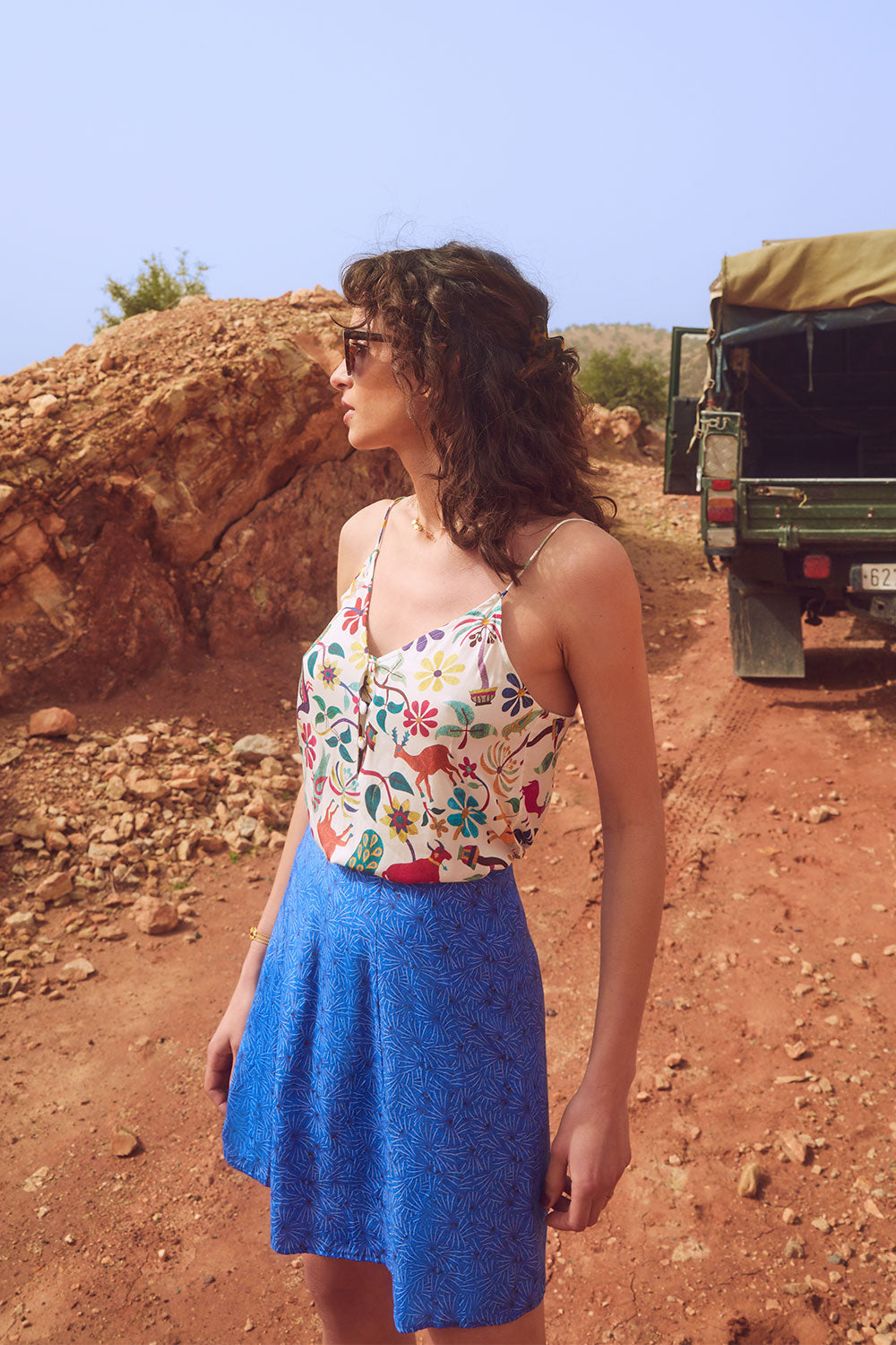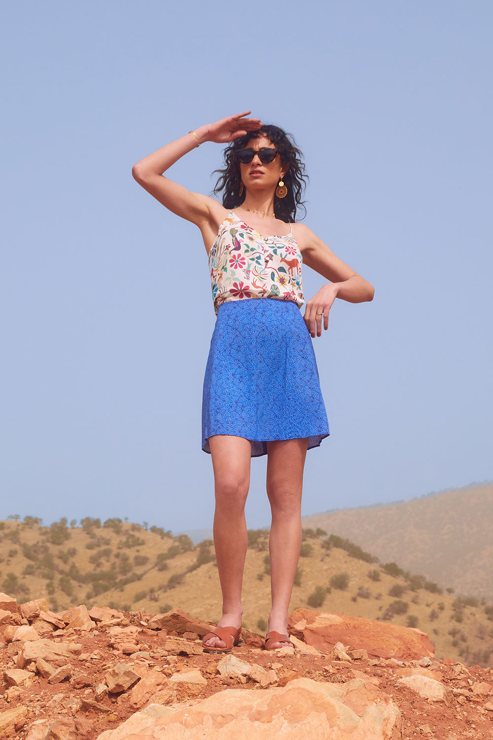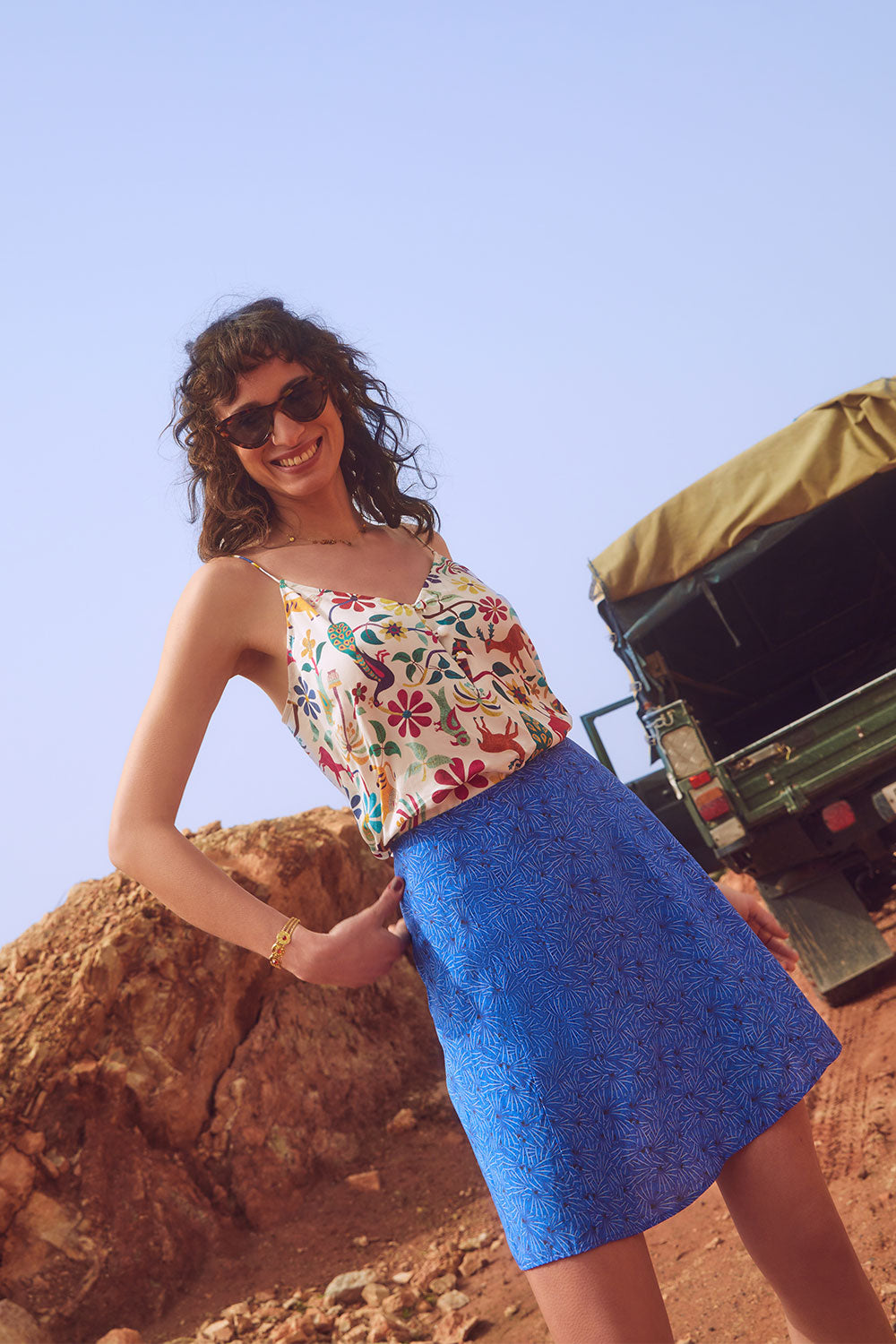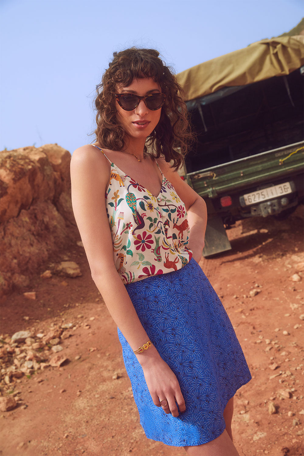 We chose this viscose for its subtle silky and shiny appearance. This viscose is printed in Italy, in the Como region, in a factory certified OEKO TEX and Chemical Management 4sustainability, which attest the elimination of harmful and toxic substances during production, guaranteeing respect for people and the environment. This product is then made with care and expertise in Europe, in an ISO 9001 and ISO 45001 certified workshop specialising in fluid and light fabrics.