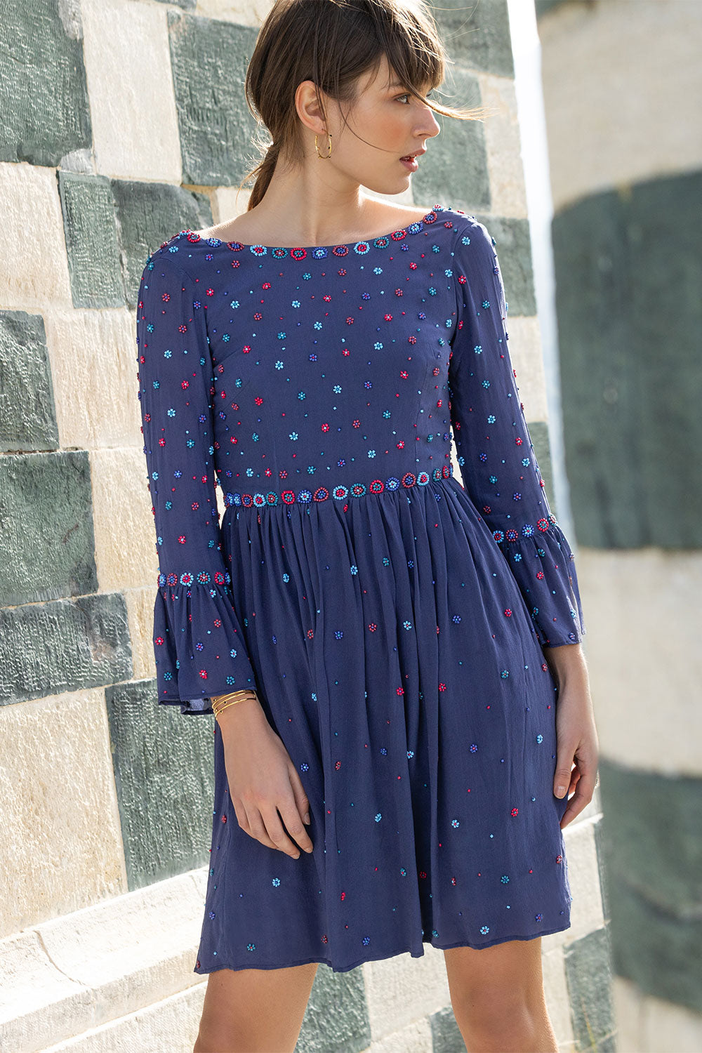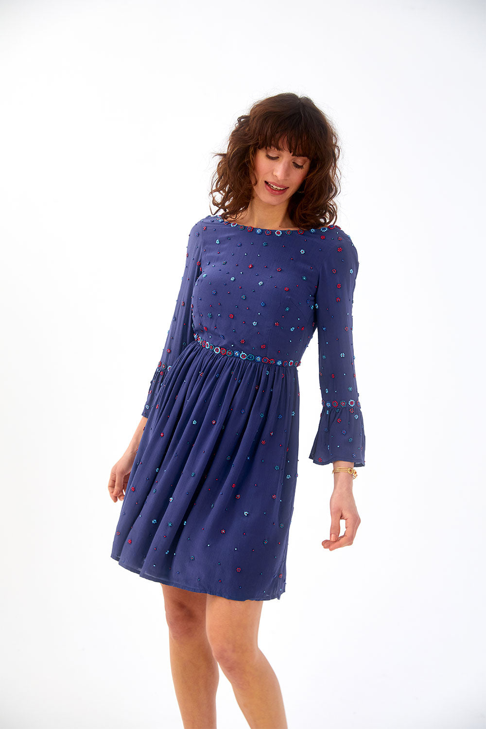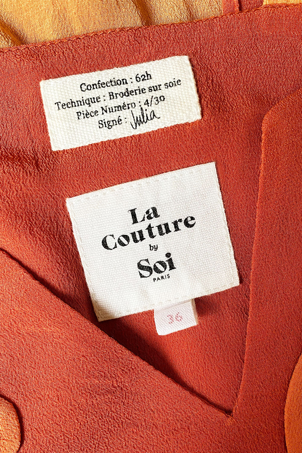 This silk with its crepe effect for its fluid drape and slightly grainy texture is woven and printed with care and expertise in an OEKO-TEX® certified factory. This certification guarantees the elimination of harmful and toxic substances during production, ensuring respect for people and the environment. This dress requires more than 50 hours of work and has been handmade in a certified workshop in India, the land of embroidery, hosting a cooperative of talented women.