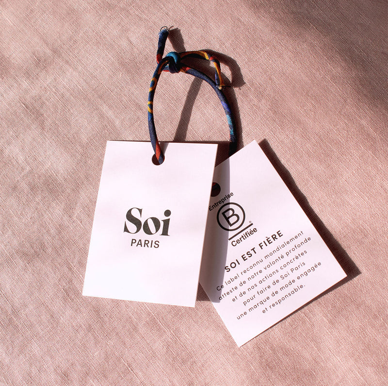 L'étiquette est attachée grâce à un bracelet fabriqué à partir de nos chutes de tissus. Pour encore plus de transparence, un QR code vous permet de découvrir les secrets de fabrication de votre pièce et d'en savoir plus sur nos ateliers.