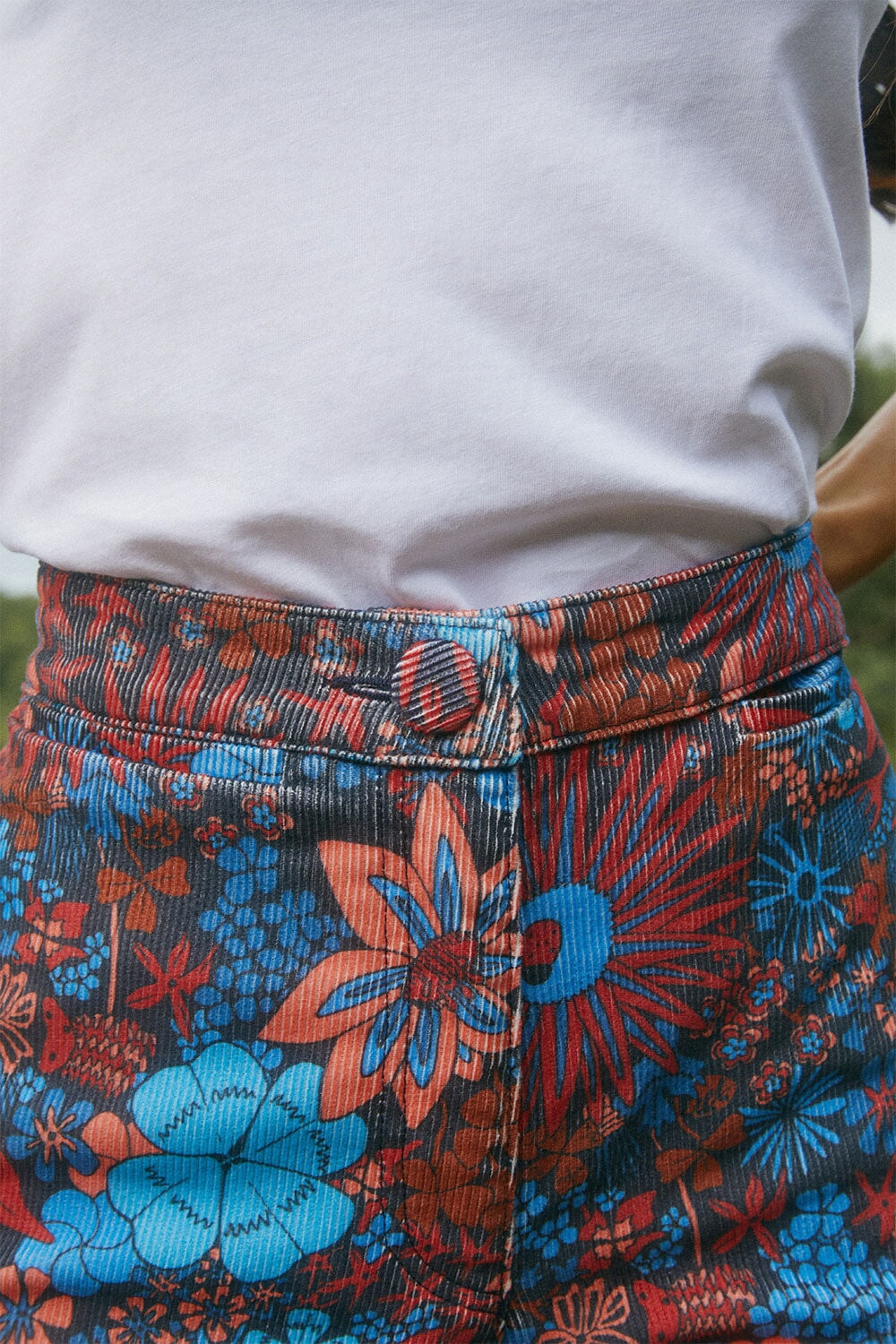 Nous avons choisi de transposer nos imprimés colorés sur ce velours de coton côtelé pour son confort absolu, idéal pour la saison. Il permet de donner une certaine structure au vêtement et ne se froisse pas. Ce produit est confectionné en Tunisie à Sadaya dans un atelier certifié GOTS et audité BSCI.