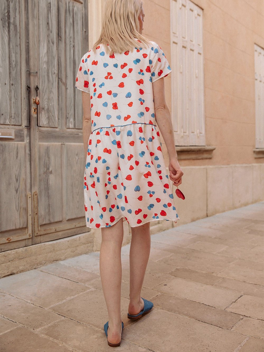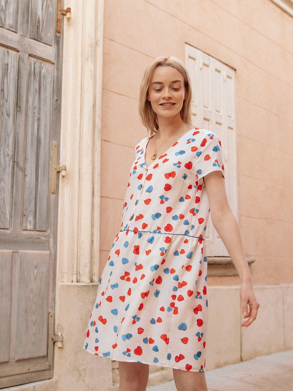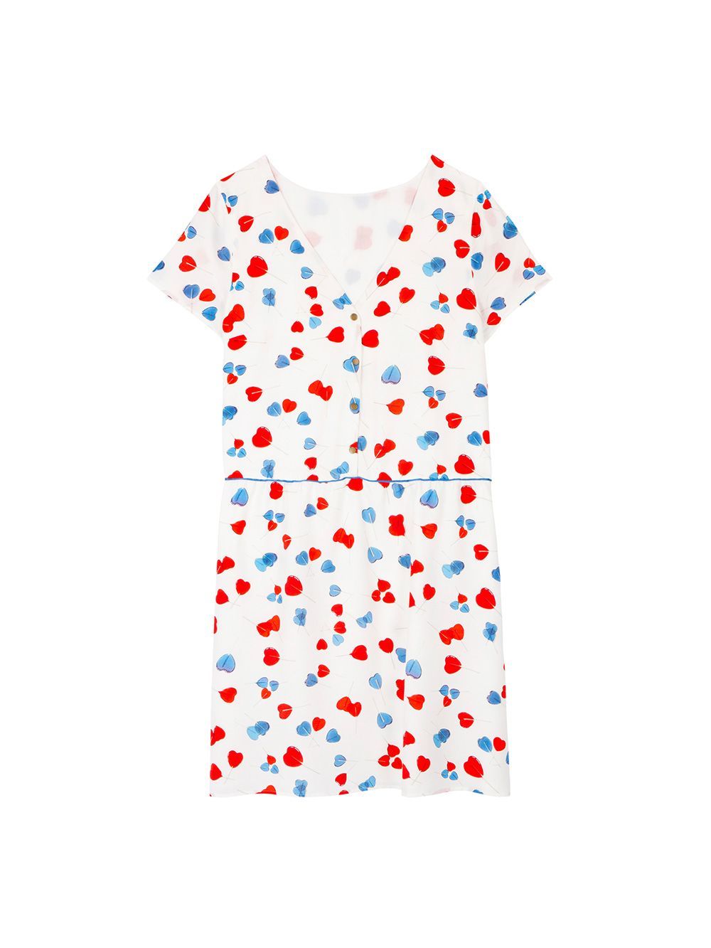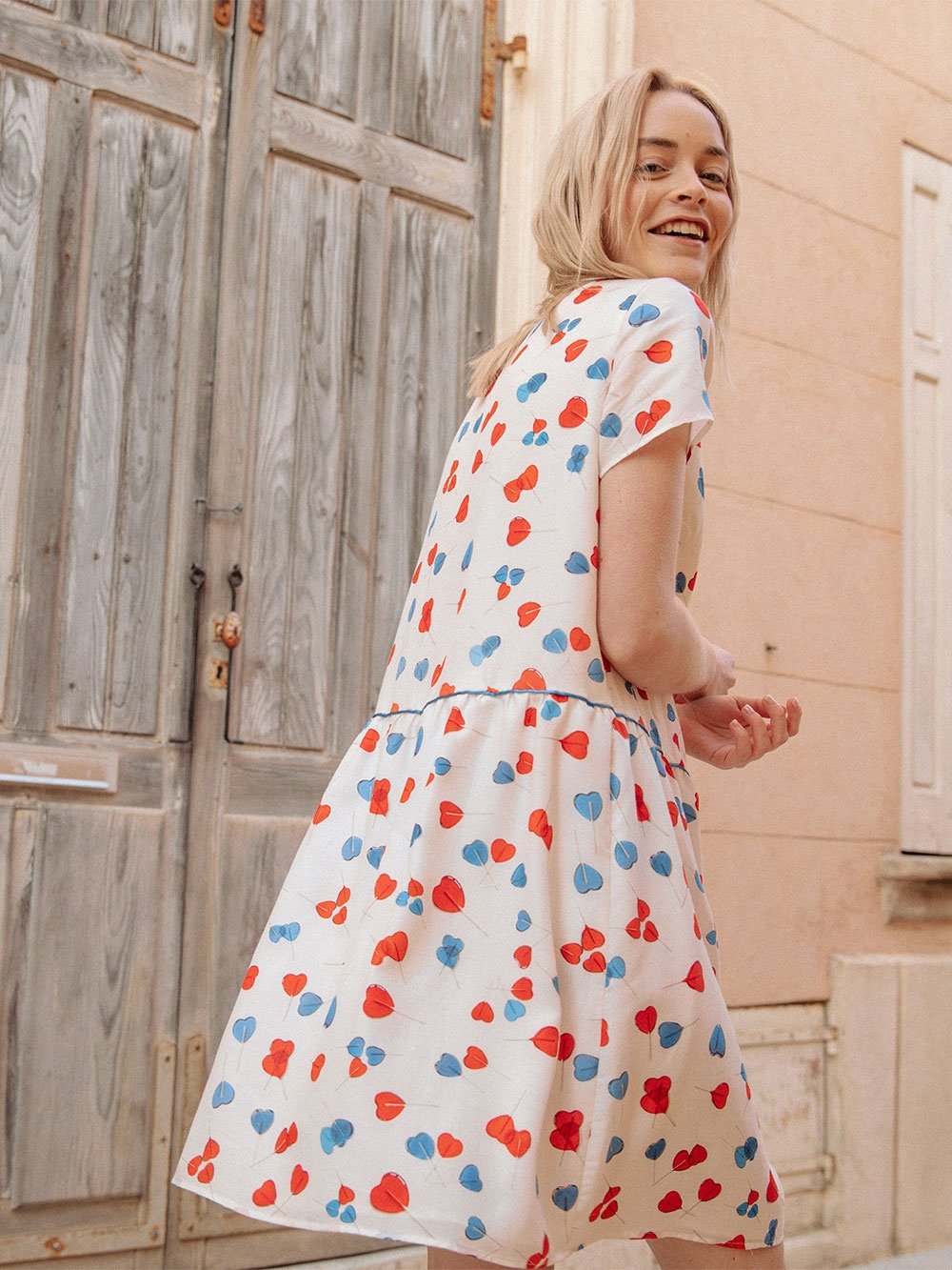 DESCRIPTION : La parfaite petite robe imprimée facile à enfiler. Sa coupe ample, sa douceur et sa légèreté vous donneront envie de la porter tout l'été ! LES DETAILS : • Un joli décolleté en V • 4 boutons pression métalliques • Un passepoil bleu à la taille